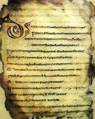 This book, called The Cathach or The Psalter of Saint Columba, still exists and is held by the Royal Irish Academy. The main text is written in Latin, as all holy books of the period were, but it has notes above the main text in Old Irish, and these make it the earliest known writing in the Irish language.