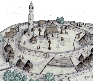 As in this artist's impression, the original monastery at Swords was built of small thatched houses made of wattle and daub, which was woven wood plastered with mud, with a larger one serving as the monks' chapel.
